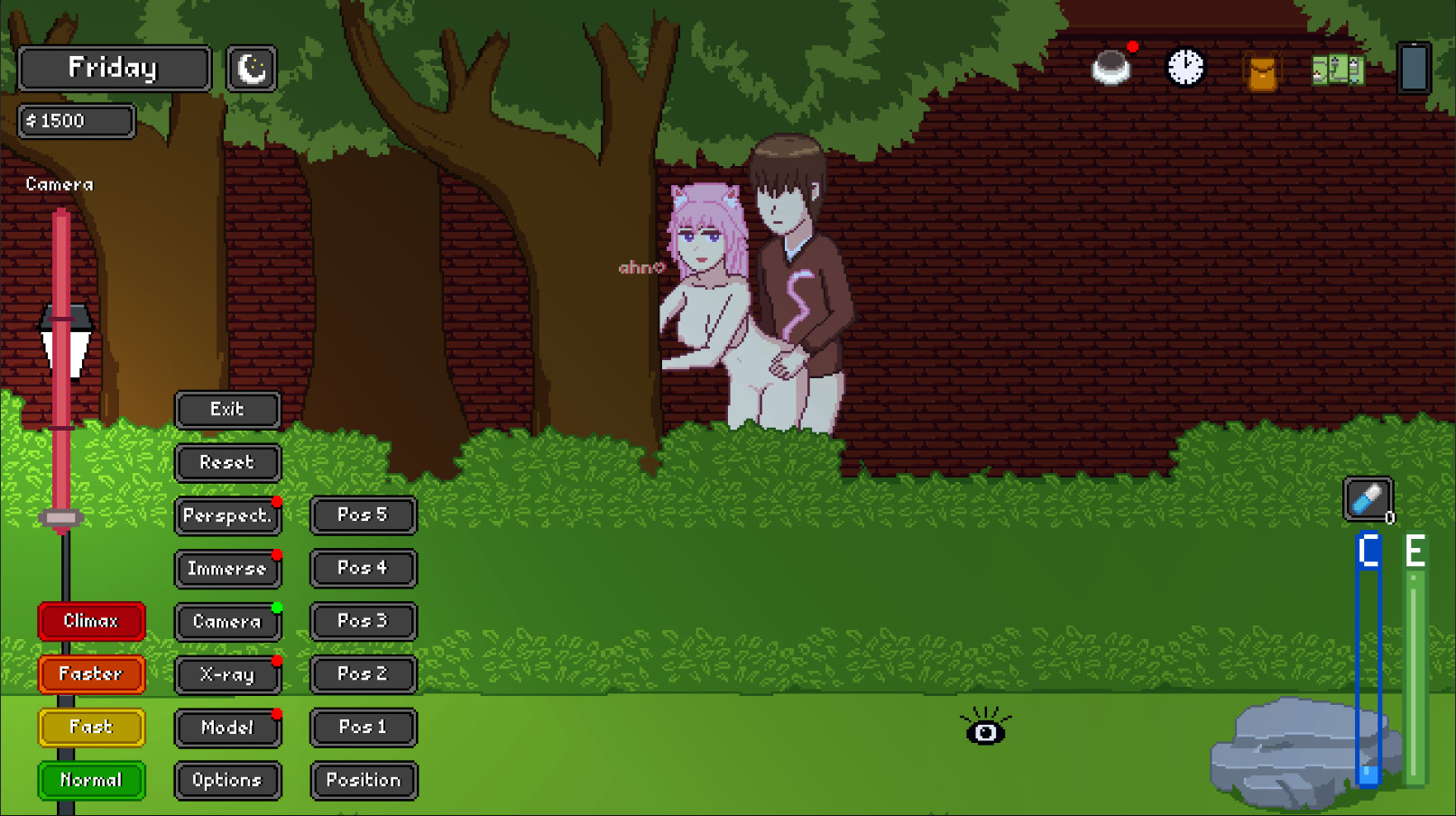 Make use of a feature-rich H-mode with features including Camera zoom with movement, X-ray, a Male Transparency Slider, Speed adjustments, Immerse and Perspective. Each sex position is mostly unique and has three states: Movement, Climax, and Rest.